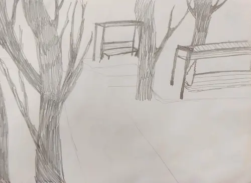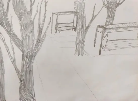 Я выполнил свою работу графическим карандашом.На ней изображен парк с деревьями, лавочками и большими качелями.Эти качели в форме лавочке на цепях.Я очень люблю на них качаться
