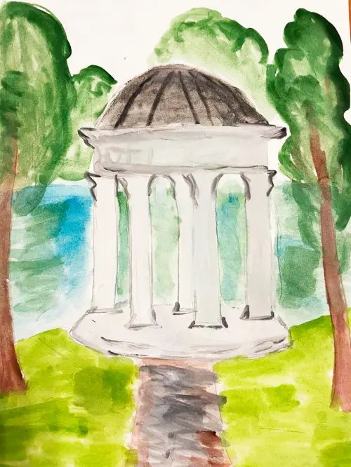 Мы гуляли с мамой по природному парку «Заречье». Я увидела красивую белую беседку, мама сказала, что это беседка называется Ротонда. Я очень люблю там гулять и наблюдать за утками.