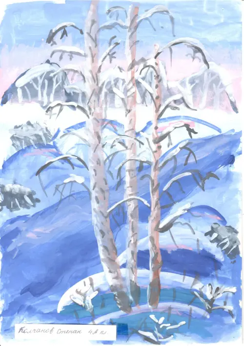 Пейзаж написан гуашью. Я изобразил березы в морозный зимний вечер на закате дня. Ветви березы в инее, пушистые сугробы покрыли кусты, поэтому похожи на холмы.