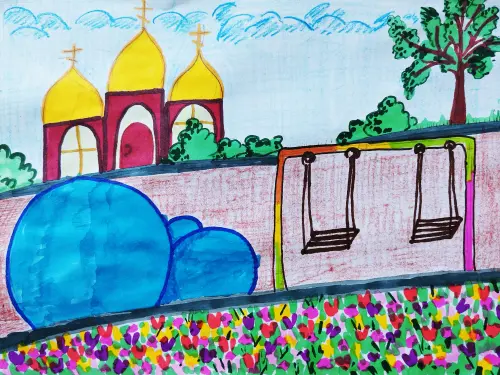 Я нарисовал дорогу к храму. Я очень люблю гулять по ней, она прекрасна в любое время года! А еще на ней есть качели, красивые шары и яркие цветы на клумбах.
