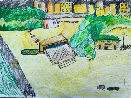 Я изобразила мой двор ночью, когда на улице никого нет. Ночью светят фонари, и это очень красиво. Я знаю, что в картине слишком много желтого, но мне так больше нравится. Сейчас у нас во дворе меняют детскую площадку, поэтому ее нет. Картина нарисована цветными карандашами и восковыми мелками.