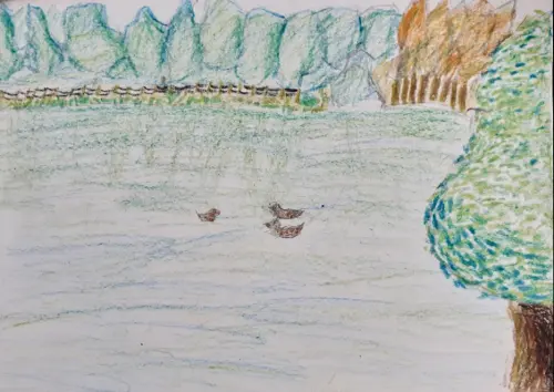 Я люблю гулять по нашему району и кормить уточек в прудах Терлецкого парка. Я нарисовала наш парк масляной пастелью. Мы занимались с изостудией — рисовали на природе.