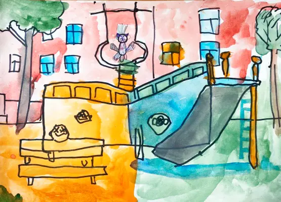 Когда я гуляю во дворе, ко мне приходит котик. Он серый и пушистый, я с ним дружу. На моем рисунке нарисован мой двор, горка и качели. А на лестнице сидит котик.