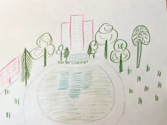 На рисунке изображена уютная клумба с цветами, вокруг которой расположены деревья, школа и дома. Всё это создаёт атмосферу спокойствия и уюта, напоминая о теплых летних днях в провинциальном городке.