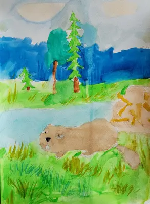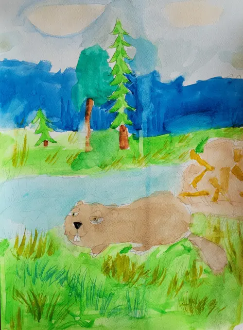 На рисунке изображён бобёр, который сидит на берегу реки возле своей хатки, а вокруг бобра лес. Такую картину мы наблюдали, когда ходили гулять в парк «Лосиного острова».