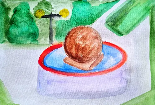 Я нарисовала фонтан. Фонтан очень красивый. Мне он нравится, потому что на нем большой шар и он крутится. Мы с мамой и братом любим гулять возле фонтана.