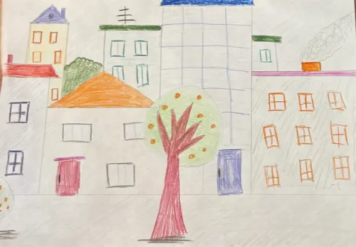 На рисунке изображен живописный район Академический, где преобладают многоквартирные дома, окруженные зелеными насаждениями. Вдали виднеется контур школьного здания, а вокруг множество высоких деревьев и кустарников. По улицам района виднеются прохожие и машины, создавая атмосферу активной городской жизни. В центре рисунка находится уютная клумба с яркими цветами, добавляющая радостный акцент в окружающую среду.