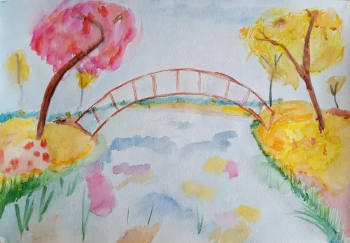 На рисунке изображён деревянный арочный мостик, который перекинут к островку на Бабаевском пруду. Внизу на переднем плане видна ровная гладь пруда, а по обе стороны деревья, склонившиеся к воде.