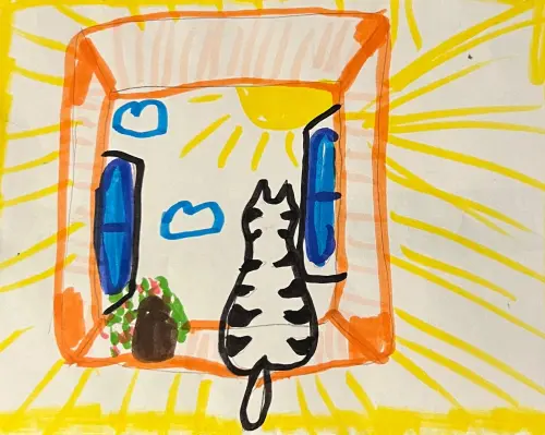 Рисунок «Вид на мой район» показывает, как я вижу мир из окна моей комнаты. На рисунке изображена моя кошка, сидящая на подоконнике и глядящая в окно на яркое солнце, голубое небо и белые облака. Техника выполнения: фломастеры.