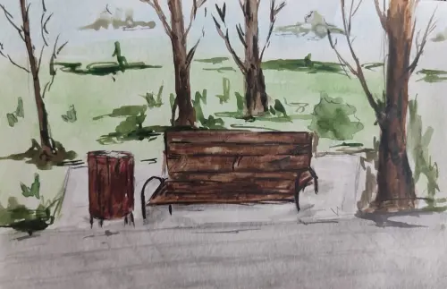 На рисунке изображена скамейка в парке, стоящая в тени высоких деревьев. Деревья окружены зелеными лиственными и хвойными растениями, а вдали виднеется небо, которое просвечивает сквозь листву. В этой простой картине передана гармония и уют лесного уголка.
