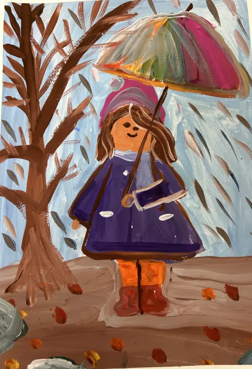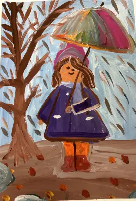 На рисунке изображена типичная московская улица в районе Митино в осеннем периоде. На фоне изображено дерево. Девочка стоит под зонтиком в теплом осеннем пальто. В воздухе царит осенняя прохлада. Общий вид рисунка передает атмосферу осеннего дня в Митино с его уникальной комбинацией красок природы и городской суеты.На рисунке изображена типичная московская улица в районе Митино в осеннем периоде. На фоне изображено дерево. Девочка стоит под зонтиком в теплом осеннем пальто. В воздухе царит осенняя прохлада. Общий вид рисунка передает атмосферу осеннего дня в Митино с его уникальной комбинацией красок природы и городской суеты.