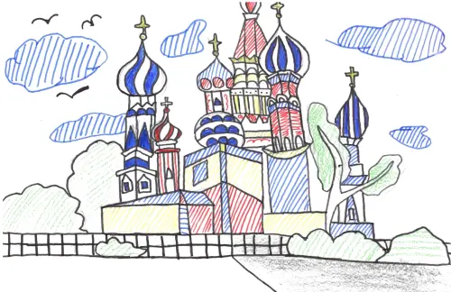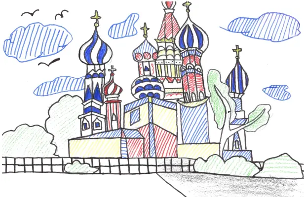 Я нарисовала именно Храм Василия Блаженного, потому что я обожаю красивые и высокие культурно-исторические объекты. Разноцветные купола, которые расположены на башнях этого храма, прям просят, чтобы их обязательно нарисовали!