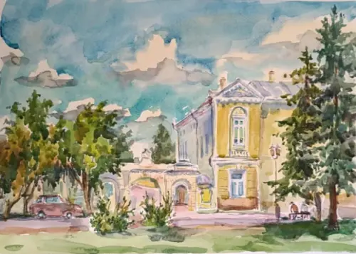 Картина написана «Московский дворик» под впечатлением от увиденного в одном из старых дворов, который встретился в Москве.