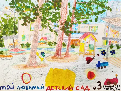 Я нарисовала свою площадку в детском саду. Мы с ребятами любим на ней гулять. Там есть веранда с игрушками, песочница, домик для принцесс, машина, на которой мы путешествуем. А еще я придумала нарисовать радугу, дождик и цветы на участке, чтобы было красиво.Я нарисовала свою площадку в детском саду. Мы с ребятами любим на ней гулять. Там есть веранда с игрушками, песочница, домик для принцесс, машина, на которой мы путешествуем. А еще я придумала нарисовать цветы на участке, чтобы было красиво, и игрушки, в которые мы играем. Я еще нарисовала покрывало, на котором можно сидеть, лежать, рисовать и играть.