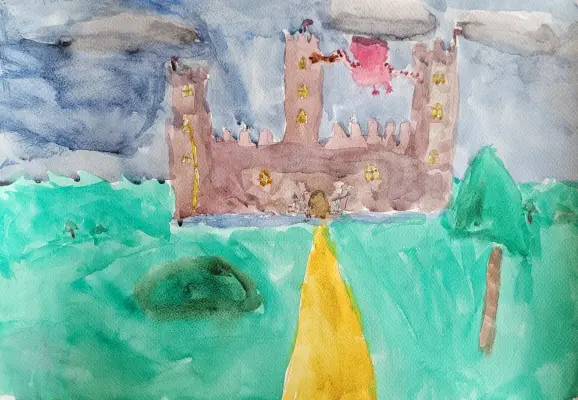 На рисунке изображен сказочный замок. Почти такой же большой и красивый замок появился и у нас в районе у Гольяновского пруда. Еще издалека видны его высокие каменные башни и стены.