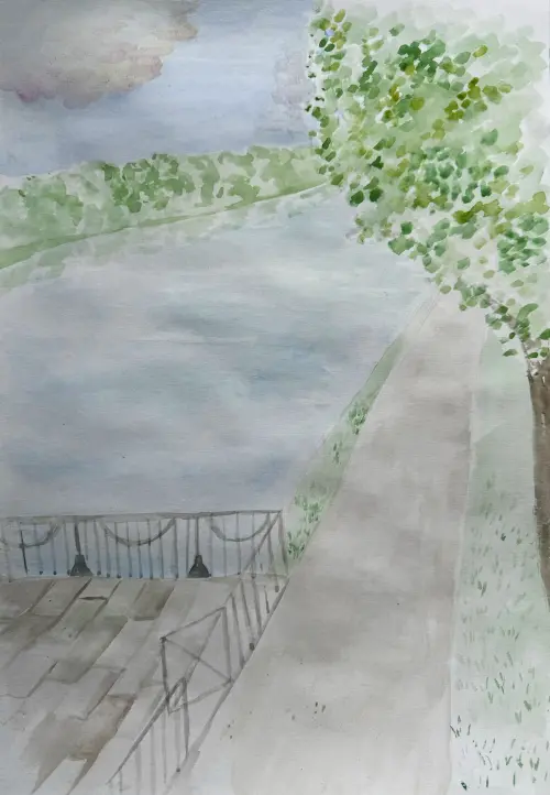 На рисунке изображены пристань Троице-Лыково и набережная вдоль реки Москва. Эти места расположены в зеленом районе — Строгино. Это лучшее место для прогулок, потому что именно здесь открывается красивый вид на Серебреный Бор и на водную гладь.