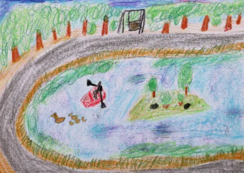 Работа выполнена в технике восковые мелки, в рамках интерактивной летней программы "Лето на планете "Гермес", под руководством педагога по рисованию Е. В. Костиной.