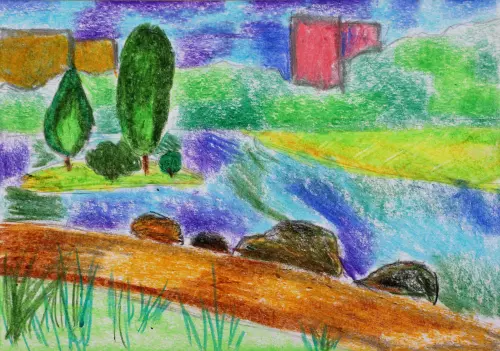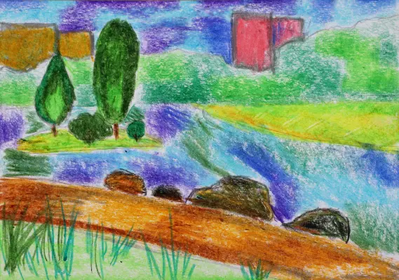 Работа выполнена в технике восковые мелки, в рамках интерактивной летней программы "Лето на планете "Гермес", под руководством педагога по рисованию Костиной Е.В.