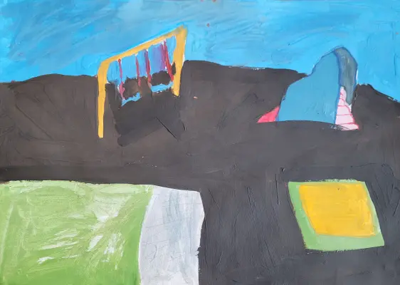 На рисунке изображена детская площадка с разнообразными игровыми элементами: качелями, горкой и песочницей. Это площадка находится возле моего дома. Мы с ребятами часто там играем.