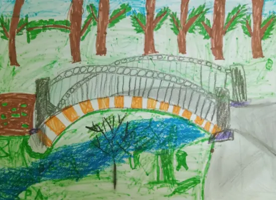 Симпатичный красный мост находится у нас в лесу Кузьминки. Мы с братьями очень любим пробегать по нему. Он такой необычный. Зимой он белый, снег укрывает его.