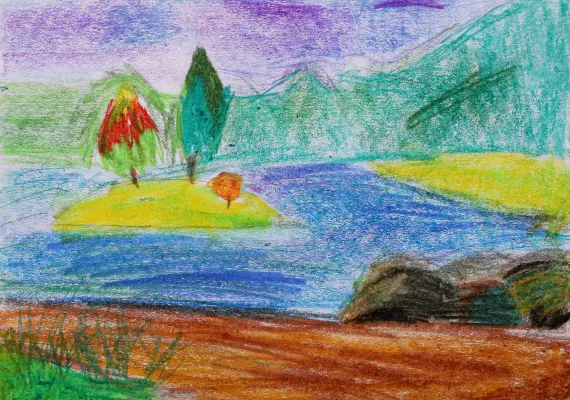 Работа выполнена в технике восковые мелки, в рамках интерактивной летней программы "Лето на планете "Гермес", под руководством педагог по рисованию Костиной Е.В.