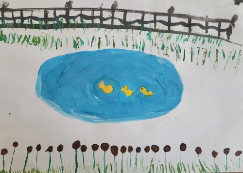 На рисунке изображён пруд. Пруд кажется спокойным и тихим. На берегу растут цветы и трава, а в воде плавает уточка с утятами. Пруд находится возле леса.