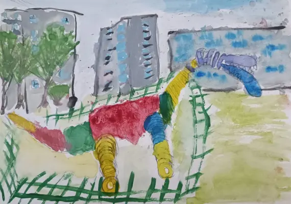 Мне нравится гулять в нашем зеленом дворе. На детской площадке у нас живет Динозавр. Во время субботника мы его покрасили, динозавр у нас теперь нарядный