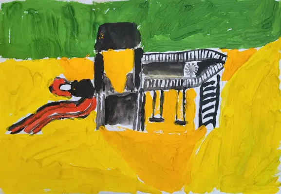 На рисунке изображена детская площадка с разными элементами: качелями, горкой и домиком. Это целый комплекс, где можно весело провести время вместе с друзьями.