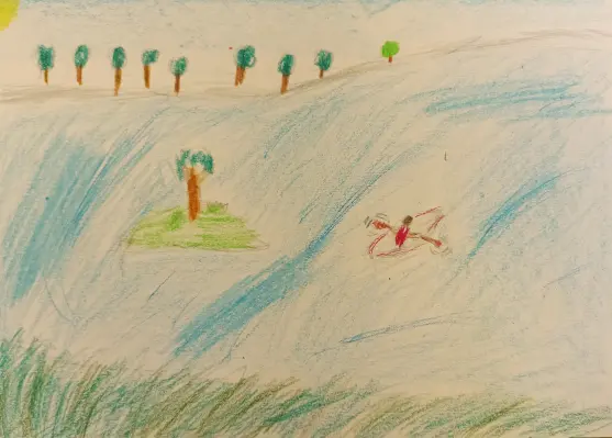 Работа выполнена в технике восковые мелки, в рамках интерактивной летней программы «Лето на планете „Гермес“, под руководством педагога по рисованию Лыковой Н.В.