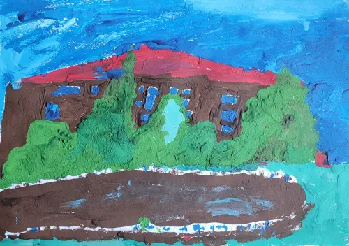 На рисунке изображен дом, в котором я живу. Он располагается недалеко от леса, поэтому каждое утро мы можем слышать в открытые окна, как поют различные птицы.