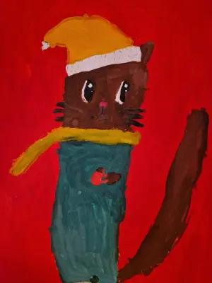 Я нарисовала котика, который гулял по району со своей хозяйкой. Он был такой милый, что я его нарисовала и решила одеть его в разноцветный костюмчик. Я очень люблю животных на прогулке в моем районе.