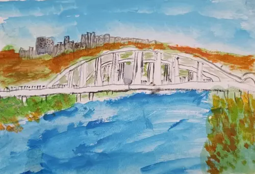 Я нарисовала мост по которому мы идем или ездим в Серебряный бор. Под мостом течет река Москва. В нашем районе построено много новых высотных домов.