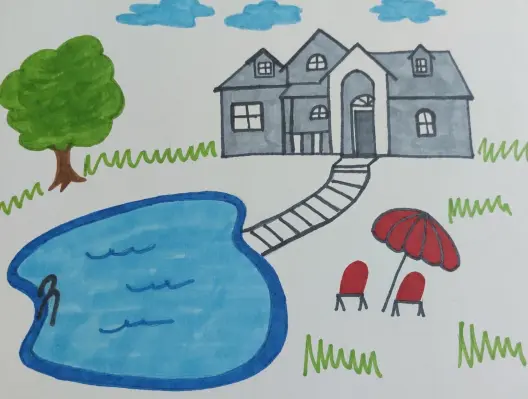 На своем рисунке я нарисовала свой дом. И немного помечтала, чтобы сразу из дома по дорожке попасть в бассейн. Посидеть под зонтиком. Очень хочется.