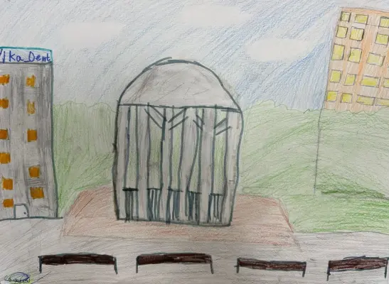 На моем рисунке изображена ротонда, которая находится на бульваре. На скамейках хорошо посидеть, отдохнуть и опять побежать дальше. Высокие дома видно.На моем рисунке изображена ротонда, которая находится на бульваре. На скамейках хорошо посидеть, отдохнуть и опять побежать дальше. Высокие дома видно.