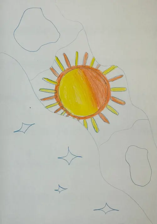 Я нарисовал небо, когда я выхожу на балкон, то вижу солнышко, которое протягивает добрые лучики. Облака, как пушистые котята, плывут по небу. Всем хорошо.