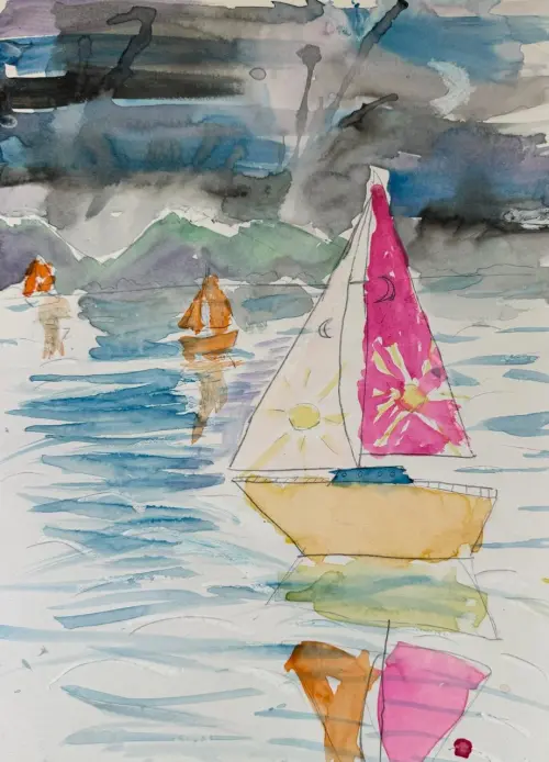 На своем рисунке я изобразила маленькие яхты. У нас рядом протекает река и мы часто ходим смотреть на яхты, лодки, которые плывут по реке. Очень красиво.