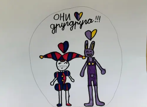 На своем рисунке я нарисовала клоуна и зайчика, они держаться за руки — лапы. Надо нам всем дружить, никого не обижать. Поддерживать друг друга.Всем хорошо.