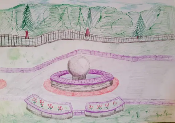 У нас на Сиреневом бульваре 2 фонтана. Оба красивые. Но тот, который я нарисовала, находится по пути домой. Я каждый день прохожу мимо него. На зиму его закрывают, и я всегда очень жду весну, когда его откроют. Он в виде большого шара, который крутится, и по нему стекает вода, а по кругу разноцветные фонтанчики. Я ДАЖЕ ВИДЕЛА, КАК В ЖАРКУЮ ПОГОДУ ТАМ КУПАЛИСЬ ДЕТИ, НО МНЕ МАМА НЕ РАЗРЕШИЛА, А ТО Я БЫ ТОЖЕ ИСКУПАЛАСЬ.