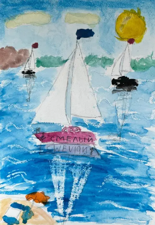 Я нарисовала яхты с белыми парусами. Мы гуляли вдоль канала и увидели несколько белых яхт, которые играли как-будто в догонялки. Ветер шалил с их парусами.