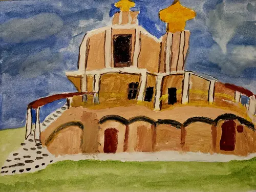На рисунке изображен Храм святых благоверных князей Бориса и Глеба в Зюзине. Замечательное и тихое место. Любим ходить всей семьёй.