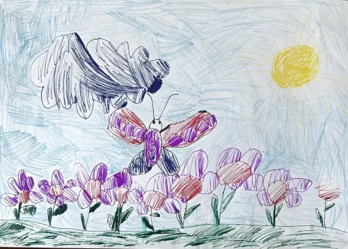 Вокруг бабочки я нарисовал пушистых пчелок, они собирают нектар с цветов. А еще там улыбается солнышко и все вокруг такое яркое и веселое! Мне было так весело рисовать эту картинку, я старался сделать ее самой красивой. Когда я на нее смотрю, у меня сразу хорошее настроение!