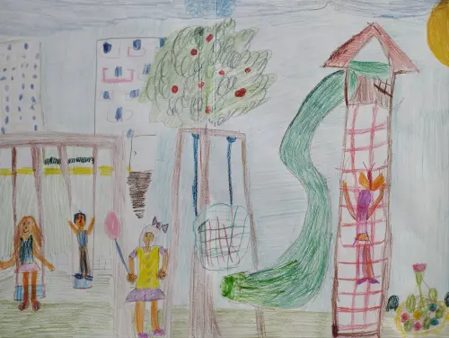 Во дворе моего дома находится детская площадка, где мы с сестрой и другими ребятами проводим много времени. Наша площадка очень красивая, здесь много деревьев и цветов. Я нарисовала, как мы качаемся на качелях, а наши друзья играют в песочнице, лезут по «паутине» на башню.
