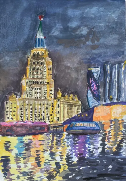 На картине представлено ночное время суток. Ярко освещена светом огней Москва река. Над ней стоит прекрасное здание, которое очень заметно и является одной из главных составляющих этой работы. Чуть подальше находится Москва Сити, которое тоже излучает свет. На Москве реке нарисован корабль, который приплыл к причалу. Общая атмосфера спокойная и комфортная. Так и хочется оказаться там, картина прямо переносит нас в это место.