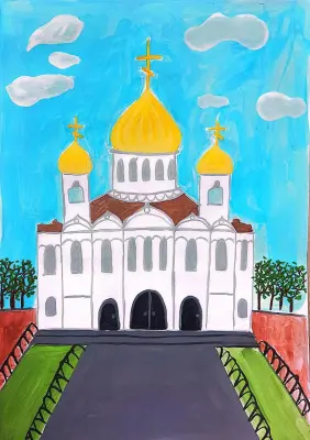 Варвара ходила с бабушкой в церковь и ей очень понравились купала, как они сверкают в лучах солнца, какие ухоженные газоны и деревья вокруг храма. Это она постаралась передать в рисунке. Работа выполнена гуашью.