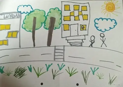 Мой район самый лучший. Я решил нарисовать его цветными карандашами. Я люблю гулять, у нас есть парк. Это набережная. По реке ходят пароходы. В нашем районе много интересного и красивого.