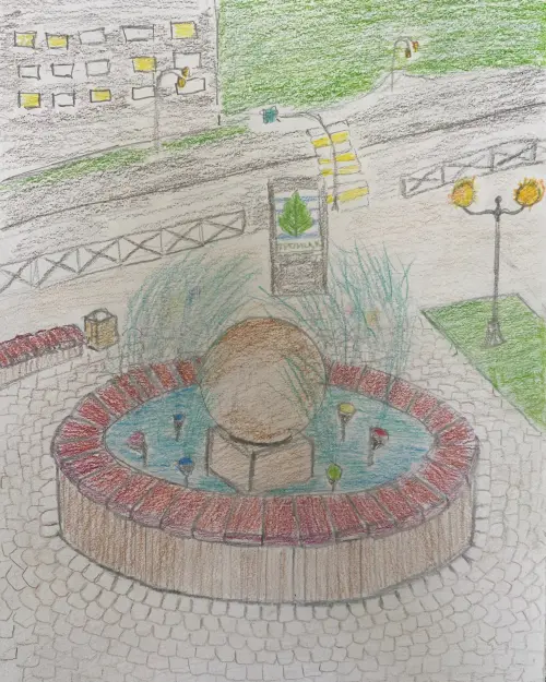 Я нарисовала свое любимое место на Сиреневом бульваре. Это фонтан «Шар». Я люблю гулять здесь со своей семьей, в жаркую погоду тут очень здорово, от фонтана летят брызги, а еще тут рядом продают мороженое. Вечером, когда темнеет, включается разноцветная подсветка у фонтана и становится очень красиво.