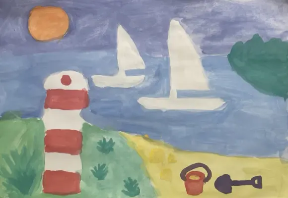 В своём рисунке я хочу показать свой любимый район, в котором я живу, Строгино. В Строгино есть Москва река, в которой я очень люблю купаться, играть в песке, строить песочные замки и смотреть, как по реке плывут небольшие корабли и лодки. Когда я вырасту, я обязательно поплыву по нашей реке на большом корабле! У нас в Строгино очень много зелени, деревьев и цветов! А ещё много школ и детских садов. Я очень люблю свой район! Обязательно приезжайте ко мне в гости и я покажу вам, как у нас в Строгино здорово!