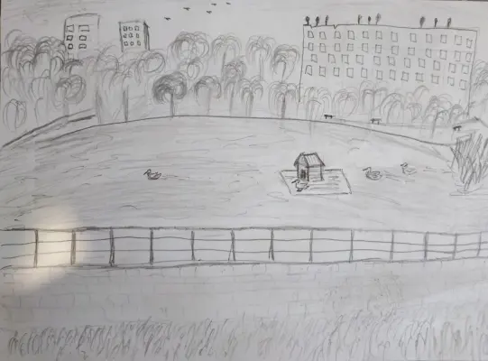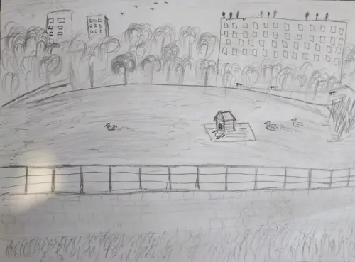 Когда я гуляла с мамой около Богдановского пруда. Я решила его нарисовать. Почему решила, потому что я люблю там часто гулять. Я там отдыхаю. А когда наступает весна, на этот пруд прилетают мои любимые уточки. Я их кормлю и наблюдаю как они плавают. Это самое моё любимое место. Ещё я там гуляю зимой.