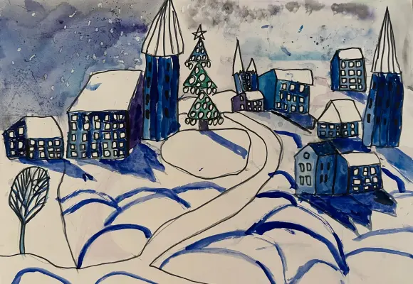 Очень люблю Арбат и очень люблю Новый год. На этом рисунке я изобразила любимый праздник в самом лучшем районе Москвы.