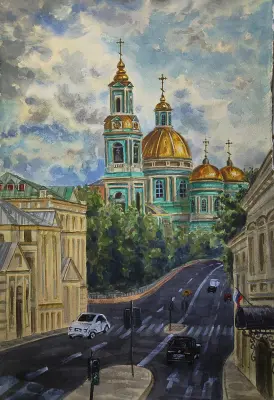 На данной картине я изобразила вид на Елоховский собор с улицы Старая Басманная в облачный летний день. Работа выполнена в технике многослойной акварельной живописи с использованием титановых белил.